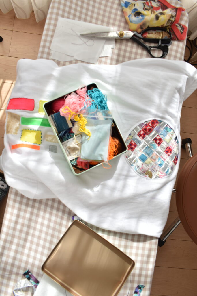 Tシャツにつけてみました。でも、なんだかしっくりこなくって、また悩みの中。これっていうかわいいTシャツを作りたいと思っています。