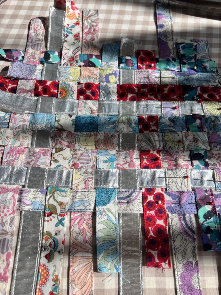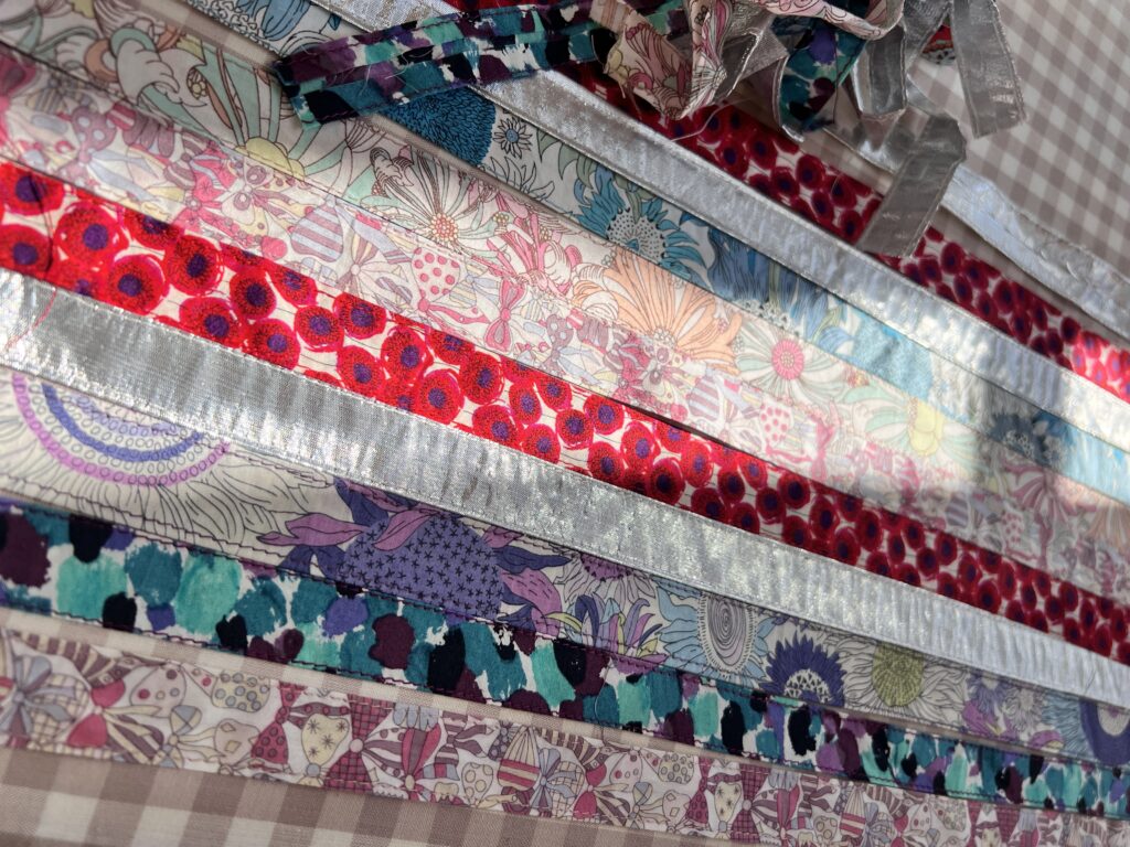 リバティの生地を紐状に縫ったもの。これで何か楽しいこと出来ないかな?としばしにらめっっこ。